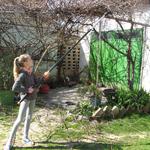 Egy kis légúti megbetegedés ürügyén Budapesten élő 12 éves leányunokám nálunk tölthette az elmúlt hetet. A kiváló időjárás jó hátteret biztosított a kertészhorgász-neveléshez. A képen látható kivilugast jórészt ő metszette meg. Csak azért kellett átvennem tőle, mert egy idő után a karjai nem bírták a nehéz teleszkópos ollót.