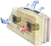 A kültéri egység nélküli berendezések olyan helyiségbe telepíthetők, ahol a kültérrel határos fal van. Telepítés után a fal külső részén csak két kb. 14-20 cm átmérőjű szellőzőnyílás lesz, melyet igény szerint rácssal eltakarható. |