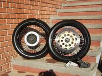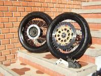 Hátul 3" széles, 17" átmérő, 130/70 -17 Mitas gumival, féktárcsa nélkül, ha jól emlékszem 43 fogú lánckerékkel, tengely és határolók nélkül, mert a DT cucca teljesen megegyezik..