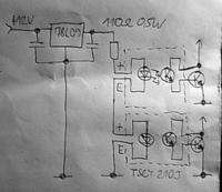 (A rajz nem teljesen jó, mert a megjelölt tranzisztortípusok valójában darlingtonok. De én a BUX37 helyett BU2525AF-et használtam, ami nem darlington, viszont van itthon egy csomó belőle valmai projektor bontásából. Ennek megfelelően a 82 ohm 4W-os ellenállat helyett 37 ohmost használtam.)