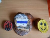 Tavasszal mikor a Bódvaszilas-Jósvafő túrát teljesítettük találtunk sok-sok kis fenyőfakarikát a Szabó-Pallag erdészház mellett amelyek favágásból maradtak vissza.Ezekből kb 5-6 kilónyit (18 karikát) végigcipeltem az úton a hátizsákban mert tudom hogy a lányom szeret ezekre festeni.Sokat kifestett közülük,ezeket nekem: