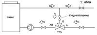 b. amennyiben az A ág előtt a hőmérséklet magasabb a nominális hőmérsékletnél, úgy az AB ágon a hőmérsékletnek 2-5°C-al magasabbnak kell lennie, mint az A ágon. A beállítást követően a szabályozószelep működtetőkarját javasolt eltávolítani, megakadályozandó a véletlen elzárást vagy elállítást."