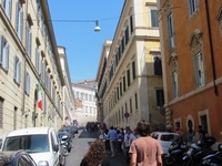 Ahogyan a Quirinale felé közeledünk, egyre nagyobb a sürgés-forgás, és a tér felől hallható morajlásból ítélve sok-sok várakozóra tippelek. Felérve számomra ismerős kép, kacskaringós kordonokkal elválasztott embersor áll a tűző napon. Catella elejt pár szót, de nyugtatom, hogy gyorsan haladunk majd, és abban is bízom, a szökőkutak vonzása és csábereje is besegít. Szerencsére valóban így is volt. A sorban állva magyarul szólít meg minket egy leánycsapat 2 tagja, velük is váltunk néhány szót. Kiderül, hogy az esti géppel utaznak vissza ők is, a spanyol nyelv gyakorlása kapcsán Róma közeli családoknál laktak 1 hétig. Szomorúak, hogy letelt, de vigasztalni próbáljuk őket, hogy segítünk olcsó jegyeket vadászni, jöhetnek még fel a fejjel.