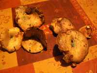 Ahogy eldugtam a bicajt egy bokorban, ezekbe botlottam. Nem sok dolgom volt rizikével eddig, most viszont -szerintem- két félét is szedtem. Az egyik rózsaszínesebb-vörösesebb elszineződést produkál, rózsaszínes-szürkés-barnás lemezekkel, a másik pedig kifejezetten narancssárga levet ereszt, és narancssárgásak a lemezei. Frissen félbevágott kép róluk :