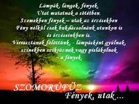 Tudod arra gondoltam, hogy az ember saját poklát teremti magának, akár a saját mennyországát, azzal, hogy mit tart fontosabbnak, mit helyez előtérbe, a fényt, vagy a sötétet: a kettőben lenni egyszerre nem lehet, valaki önmagában vagy fényt gyújt, vagy kikapcsol minden világosságot… és talán a földi pokolért is felelős az, aki nem gyújt új gyertyát, aki megfosztja a világot a fény lehetőségétől, a Földet talán körbe lehet szeretni, (vagy épp ádáz gyűlölettel átszőni)… lehet valakit megszeretni a szeretetéért, (őt viszontszeretni) és amikor már a szeretet jól megy, szaporítani, szeretni önmagáért egy idegent, neki csak viszont kell szeretni, és persze folytatni: csak a kezdet nehéz … hogy a dolog működjön, ahhoz minimum kettőt kell megszeretni, no meg azok helyett egy párat, akik arra képtelenek, mert szeretetet nem kaptak: és az már szinte természetes, aki szeretni képes, az méltó lesz a szeretetre önmagának is… ha egyszer a világra jön, nagyon gyorsan képes terjedni, csak nem szabad megállítani, s ha így tenne mindenki, a világ vele lenne teleszülve … kicsi az embernek a feladata, (talán azért jött ide, hogy ezt a bolygót kivirágoztassa) s ha mindenki eleget tenne, a Föld maga a paradicsom lehetne, s hogy valamit rosszul tesz, hogy nem él a paradicsomban, azt mutatja a világ állapota.