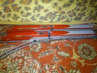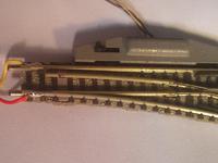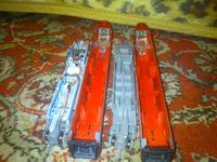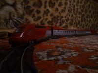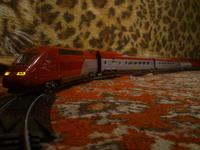 H0-ás Mehano TGV kezdőkészletes szerelvény, használt állapot. A szerelvény külsőre egyben van, leszámítva az egyik szedő csak félig van meg, illetőleg az egyik forgóvázon forrasztónyom látható. Működésileg: villágítópanelok mindkét vonófejben benne van, menetirány szerinti kettő-kettő első és véglámpa-fény; motorikusan működik, de az egyik kardáncsatlakozó törött, így önmagánál több járművet vontatni a jelen állapotában kínszenvedés neki. Ár: 6.000,- HUF
