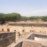 Reggeli után a 64-es busszal mentünk a Mercati Traianei-hez. A Museo dei Fori Imperiali 9:30-kor nyitott (én otthon 9 órát írtam fel, így egy kicsit várakoznunk kellett). Ide használtuk fel az RP második ingyenes lehetőségét (egyébként 14 €). Két időszaki kiállítás is volt. Pablo Atchugarry Città Eterna, eterni marmi (2015. 05.22-2016.02.07.) a kiállított modern márványszobrok nagyon jól mutattak az ókori „díszletek” között és feldobták, élővé tették a mercato hangulatát. A másik kiállítás „L’Eleganza del Cibo. Tales about food and fashion” (2015.05.19.-11.01.) a központi épületrészben a divat és az élelmiszerek köré szerveződött. Láthatóak voltak itt Yeonju Sung élelmiszerekből kreált ruhafotói. Néhányról elég nehéz volt kitalálni, hogy mi is az alapanyag. Voltak még különböző próbababákon kiállított ruhák és ezekhez kapcsolódó digitális installációk valamint különböző témákban (pl. gyümölcs ihlette) ruhák, táskák, cipők és egyéb kiegészítők. Jól megfértek ezek a kiállítások az ókori emlékek tárlataival, melyek szintén nagyon érdekesek voltak. Egy teremben (XII. - XIII. századi ciszterna) rengeteg különböző méretű és formájú amfora volt kiállítva. Sok ismertető anyag volt a Császári Fórumokról is, alaprajzokkal és makettekkel szemléltetve és az ásatások lelet anyaga is jelentős. A Mercato felsőbb szintjeiről remek kilátás volt az alatta elterülő romokra és épületekre. Az egész komplexum csodálatos! 11.30-kor hagytuk el az épületet (mint később kiderült Zoltán ott hagyta a napszemüvegét, ezzel szaporítva az Itáliában hagyott napszemüvegeinek számát), elsétáltunk a Colosseo metró megállóhoz és a Piramide-ig utaztunk, itt átszálltunk az FC2 (Roma Lido) vasútra és az Ostia Antica megállónál szálltunk le. Rövid séta után érkeztünk a bejárathoz. Az RP-vel kedvezményes jegyet vettünk, mely 6 €, (a pénztáros – technika híján – nem tudja ellenőrizni az RP érvényességét, így telefonon kellett bediktálnia a kártyák azonosítószámát ahhoz, hogy a kedvezményt meg tudja adni), egy térképet is beszereztünk (2 €) a terület felfedezéséhez. Itt is nagyon meleg volt, de jobban járt a levegő, egy-egy szellő hozott némi felfrissülést. A bejárathoz közeli első árnyékos helyen lepihentünk és a már „szokásos spártai” ebédünket elfogyasztottuk. Az első kútnál feltöltöttük magunkat és a flakonjainkat friss hideg vízzel és indultunk a rendkívül nagy terület felfedezésére, ahol rajtunk kívül nem sok ember volt. Az első látnivaló a Necropoli, ahol sok sír maradványait tárták fel. Térképünk a Tomba degli Archetti-t emelte ki, melynek gyönyörű a díszítése. Tovább haladva a „Terme di Nettuno” romjait csodáltuk meg, a gyönyörű mozaikokkal. A közeli színház lépcsőiről a Piazzale delle Corporazioni-ra látni, ahol 60 mozaik mesél az ókori kereskedelmi társaságokról (hajók, áruk, tengeri élet, kikötői tevékenység stb.). Nincs erre más szó: CSODÁLATOS. Az információs táblák képekkel, rajzokkal, alaprajzokkal segítik az emberi fantázia szárnyalását. Megtalálhatók még itt raktárházak, insulák, vendéglők, templomok, piacok, gazdagabb polgárok házai, több fürdő és malom. Nagyon jól meg lehet figyelni a városszerkezetet, mivel több helyen fel lehet menni az épületek tetején kialakított „kilátókra”, ahonnan messzire be lehet látni a terepet. A múzeum itt is felüdülést jelentett hőmérsékletével és pihentető padjaival. A kiállítás is érdekes volt, nincs túl zsúfolva, könnyen áttekinthető. Miután itt is kigyönyörködtük magunkat visszatértünk a „szabadtéri múzeumhoz”. Egyszerűen nem lehetett betelni vele, húzott, vonzott magához. Ennek az lett a következménye, hogy nem a lábunk elé néztünk és Zoltán elég rendesen megrántotta a bokáját egy kis kődarab miatt. Így sántikálva már csak a térkép által kiemelt és még nem látott épület maradványokat néztük meg. (Az utazás egyik nagy kedvence lett ez a program. Jó lett volna sokkal több idő, kisebb hőfok – ezért ide feltétlenül szeretnénk visszamenni.) Visszaindultunk az állomásra, útközben látható a Castello di Giulio II., úgy olvastam, hogy nem látogatható. A vonatra nem kellett sokat várni, a tengerpart felé vettük az irányt. Elmentünk a Cristoforo Colombo végállomásig, itt felszálltunk a 7-es buszra és a Litoranea Cancello 2 megállóig utaztunk, ahol van egy jó szabad strand (itt a fórumon ajánlotta valaki). Körülbelül 18 órára értünk ide. Kis kompromisszummal elfogadható állapotú WC és öltöző helység állt rendelkezésre (csak 19 óráig vannak nyitva!). Átöltöztünk és kifeküdtünk a homokos partra. A strand tisztának mondható (a homokban elnyomott csikkeket leszámítva), a víz lassan mélyülő. Úgy gondoltuk, hogy a hideg víz jót fog tenni a párom lábának, de a tenger hőfoka sajnos nem volt megfelelő a gyógyászati célokra. A széle konkrétan egy elsózott meleg levesre emlékeztetett, aminek a többi fürdőző láthatóan nagyon örült. Zoltán (miután begyalogolt a megfelelő mélységű területre) úszott egy jót, én csak megmártóztam egy kicsit és pihentem a parton. Már elég éhesek voltunk, amikor jött egy idős fánkárus bácsi, de az orrunk előtt adta el az utolsó darabokat, így éhen maradtunk. Egy kicsit fátyolos lett az idő, így az a tervünk meghiúsult, hogy itt nézzük meg a naplementét. Lassan összeszedelőzködtünk, megkerestük a zuhanyzót (a táblákat követve szép nagy kört tettünk mielőtt a fák között a sártenger szélén megtaláltuk). Arra jó volt, hogy lemossuk a sót magunkról. Nem messe volt egy étterem, de úgy döntöttünk, hogy majd a vonatállomáson eszü