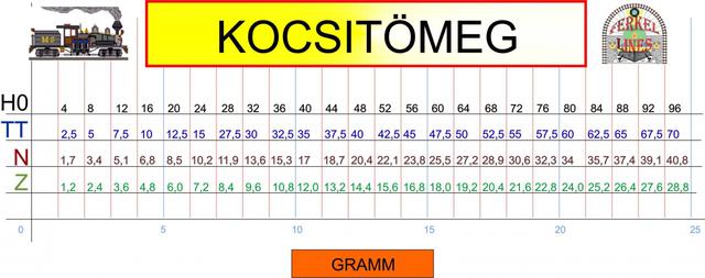 Jó ez a lista/mérőeszköz, de a H0-nál szerepelő tömegek kicsik, messze elmaradnak az NMRA ajánlásától! Az 50 lábas kocsiknak, ami kb. 17,5 cm eszerint 68 gramm, az NMRA szerint pedig 130 grammnak kéne lennie.