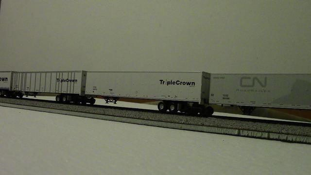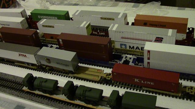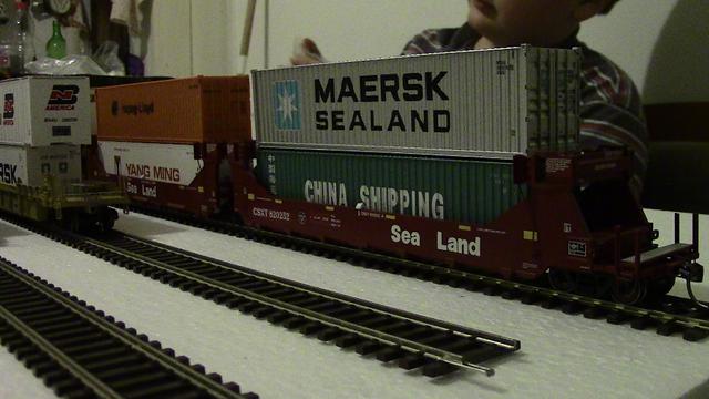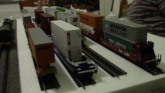 Na meg tuningolni is kéne rajtuk, az egyik flat car-omon kapcsolót (vagy a rögzítést?) cserélni kéne, mert nagyon idétlenül kitér oldalra (a másik újabb, azon már jó). A spine car-ba meg fém kerék kéne és a konténereket is variálni kell, van rajta nem odavaló (itt vettem használtan, és nem minden eredeti rajta).
