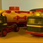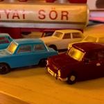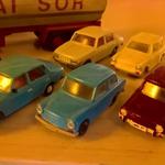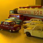 -iveco stralis kamion, tartállyal -man, dobozos kamion -4 db régi magyar RÁBA -1 tűzoltó barkas, tetődíszek nélkül -2 db wartburg, az egyik (H) matricás, magyar rendszámos(!) -3 db egyszerű trabi (a nagyon régi, fém piko autószállító kocsiról származnak) és ráadásképpen -1 db egyedi építésű skoda 100, magyar rendszámmal(!!!)