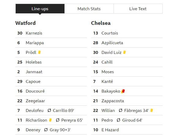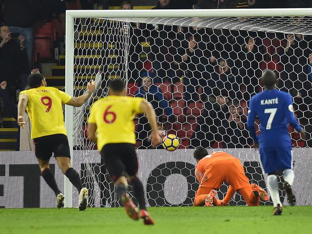 A nagyobb sokk csak ezután következett: Thibaut Courtois a tizenhatoson belül elsodorta a cselező Gerard Deulofeu lábát, a megítélt tizenegyest Troy Deeney váltotta gólra a 42. percben. 1–0