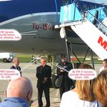 Ez a kép szerintem ugyanakkor és ugyanott készült, a HA-LBA érkezésekor. A repülőgép behajtott ajtaja ugyanis ugyanúgy áll. Az idézett filmben látható, hogy a filmfelvevőgép a lépcső jobb oldalán volt, a fotósok meg a bal oldalon. Utóbbiak valószínűleg vakuval dolgoztak. Még az is lehet, hogy nem csak egyszer jöttek le a lépcsőn, hanem annyiszor, ahányszor a rendező mondta.