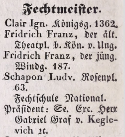 És az 1839-es Kisokosban a Nemzeti Vívóintézet -- Fechtschule National -- is szerepel.