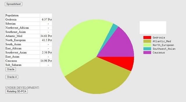 A genetikai minták autoszomális adatait Maciamo Hay a Dodecad K12b kalkulátoron futtatta le, amely az alábbi autoszomális genetikai komponenseket tartalmazza angolul):