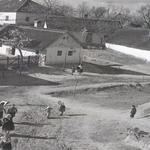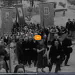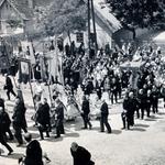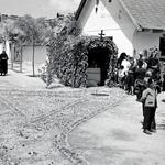 Magyarország, Csömör, a felvétel a Kossuth Lajos utca és a Deák Ferenc utca találkozásánál készülhetett.  ( Úrnapján virágszőnyeges körmenetet rendeztek) Vonulnak, jönnek a Deák Ferenc utcán és kanyarodnak felfelé a Kossuth Lajos utcára.
