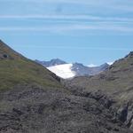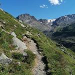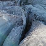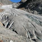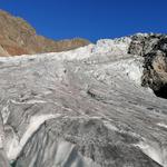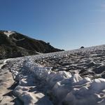 Felvettem a hágóvasaimat a beszállópontnál és megindultam felfelé a masszív, de folyamatosan olvadó jégnyelven. A délutáni napban haladva igazán szépen mutatatott a gleccser, melyeknek nem vagyok fanatikusa, de az akkor és ott tetszett. Egyben szomorú emlékeztetője is egyben a hőmérsékletváltozás problémájának. Ösvény természetesen nem volt és karók sem, de az irány adott volt, reméltem, hogy a szemben lévő több emelet magasságú durván szabdalt részhez nem lesz közöm, szerencsére nem, a nem létező ösvény a beszállóponttól bő 700 méterre jobbra fordul. Idáig nem volt sok hasadék, de a jobbos kanyar után hangsúlyosabb volt a kerülgetés, kisebb hasadékok átugrálása, de messze nem volt problémás egyik sem. A kiszállópont könnyen észrevehető, valószínűleg a közeli Rauhekopfhüttéből származó kötelek, jégcsákányok és hágóvasak mentés esetére vannak odakészítve. Elpakoltam a hágóvasamat, majd a kissé nehézkesen induló sziklás ösvényre tértem rá.