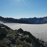 72. pillantás az olasz oldal felé az oldalvölgy (Hochjochferner völgye) irányából: távolban a Similaunhütte, tőle balra fehér ponyvával takart hóréteg, hasonlóan, mint múltkor az Eisjoch közelében