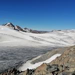 A tegnap esete megismert útvonalon haladtam felfelé, nyugat felé most a napnyugta helyett a hegyek ébredezését láthattam és mindezt teljesen egyedül, nem mozgott más a közelben. Balról kerültem a Hütte házi hegye, a Groβer Rauher Kopf (2989 m, térkép szerint ösvény nem vezet rá, de csúcskeresztje van) alatti beszállópontra a gleccser szélénél. A beszállás abszolút problémamentes, a gleccser lapos, hasadék nincsen. Negyed 7 után indultam el a jégen a fokozatosan felkelő napban, mely a jobbra az olasz határon elterülő Weiβseespitzét (Fehér-tavi csúcs, csak ez nem a tátrai, 3498 m) és az előtte lévő Zahn (magyarul: Fog, 3376 m) nevű csúcsot világította meg a legjobban.