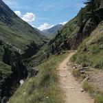 A népsűrűség viszont innen ugrásszerűen megnőtt, nem is időztem itt sokat, hanem visszavettem a zsákot hátamra és 13 óra előtt pár perccel elindultam Vent felé. A túra legvontatottabb és legunalmasabb része vette itt kezdetét. A gleccser túlélése (katarzis) és a sziklás rész elhagyása után az attrakciók lecsökkentek (ezzel nem azt akarom mondani, hogy nem egy szép hegyi környezetben gyalogoltam) és megjelent a fáradtság, fokozott nyűgösség és az „érjünk már oda” érzése. Ezt a belső állapotot a megugró népsűrűség csak fokozta, különösen idegesítő tud ilyenkor lenni pl. az az öreg páros akiket a háznál leelőztem, mivel lassan haladnak, de annyira viszont nem lassan, hogy egy normális pihenőt tudjak tartani, a többi versenyzőről nem is beszélve, szóval ez a szakasz is bekerült a „tudjuk már le” részek közé ekkor. A ház után nem sokkal jobbra van még egy kisebb tanya, ezt leszámítva kilométereken keresztül semmi különös. A füves hegyoldalban kanyargó ösvény alapvetően lejtős, egy darabig visszafelé nézve még sokáig láttam a Hochjochhospiz házat. A végtelenített ösvényen alacsony volt a haladási érzet faktor, egyedüli komolyabb látványosságot az egy-egy patakátkelés, majd a ¾ 2 felé a jobb oldalon futó Rofenbach fokozatos bevágódása a sziklás részbe, az átmenetileg beszűkülő völgyben jelentette. A kanyon-szerű részen az ösvény is emelkedni kezdett, már csak ez hiányzott a megfáradt testemnek és lelkemnek, de viszonylag hamar áthaladtam ezen a részen. Természetesen ez is egy szép rész volt, de már agyilag nem tudtam befogadni, alig vártam már, hogy beérjek a célba.