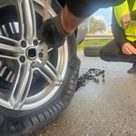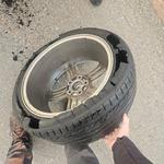 Tegnap pályán bal hátsó defektet kaptam, megálltunk egy parkolóban, pisi+ brazil, és tovább, szerencse 100-as korlátozás volt így nem mentem gyorsan, kihajtás után érdekes hangot, és vibrálást éreztem hátulról, gyanús volt így lassítottam....fülelés....majd eldurrant a gumi....megtudtam fogni, és kiálltam a leállósávba.