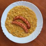 Ma tök/cukkinifőzelék, sült virsli. Egy kisebb tök és egy nem olyan kicsi, de még zsenge cukkinit gyalultam le, kis híján 1 kg lett. Fele ment a fagyóba.