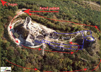 Megnézve a CastrumBene-s linket, rájöttem, hiogy ezt olvastam már a vártúránk után, amikor a várról kerestem anyagot. A várudvaron említ egy ciszternát, ami szerintem az lehet, amit a déli sziklacsúcs alatt fedeztünk fel (kisebb bemélyeséd a talajban), mivel az ÉK-i palota alatti ciszterna csak kutatás után került elő.