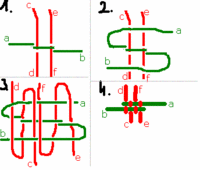 Az a és b a főszálak, ebből mindig kettő van; a többi mellékszál, azokból bármennyi lehet. Itt is lehet egyenesen és spirálisan kötni, nem egyszerű, és kicsit idegölő, de cserébe szép :) A spirál ennél azért nehéz, mert átlósan vezeted a szálakat és mindig figyelni kell, h ne gabalyodjanak össze.