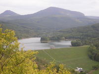 A kilátó szép, a panoráma pedig fenséges, Olaszfalutól Zircen, Kőris-hegyen át Kab-hegyig mindent lehetett látni, a másik oldalon pedig még a Balaton is megcsillant. A kilátó közelében pihenőhely is található, a láda megkeresése után lefelé indultunk. A hegynek ezen az oldalán mindenhol a hóágyúhoz szükséges csővezetékeket fektetik, a mély árkok egyikén csak átugrani lehetett:( Végül visszaértünk a pirosra, innét már közel volt a Malom-völgy. Itt az aszfaltos út mellett több pihenőhely, tornapálya, kisebb tavak találhatók. Az éles balkanyar után az út kettéágazik és murvássá válik, a miénk a bal oldali, a másik út a völgyben folytatódik tovább.