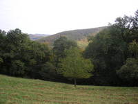 Igen ám, de az út egy széles réten vezetett, jobbra-balra hatalamas tölgyfák. Csoda szép vidék. Előttem a 302 méteres pont (egyértelmű), de "felfelé menő" szekérút nincs. Visszafordultam. Nem bántam, hogy erre menetem, mert a domboldal igen hangulatos. Már-már varázslatosan szép. Van panoráma is.