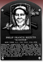 Phil Rizzuto Born: September 25, 1917 in New York, NY Height: 5-6, Weight 150. Threw and batted righthanded Number retired in 1985 Playing 13 years for the Yanks, "Scooter" went to the World Series in 10 of those seasons. That stat may best explain why the diminutive shortstop is regarded as a true Yankee legend. He was a durable, outstanding shortstop, skilled bunter and enthusiastic baserunner with a solid .273 lifetime batting average. In 1950 Rizzuto earned the A.L. MVP Award, batting .324 with 200 hits, 92 bases on balls, and 125 runs scored. He batted .320 in the 1951 World Series and was named Series' MVP. Spent 40 years as a Yankee broadcaster (1957-96). Elected to the Hall of Fame in 1995.