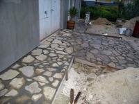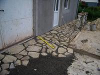 Én speciel nem kedvelem a szabálytalan köveket, a felfekvésük problémás lehet, meg a felületük is, ha járni kell rajta, márpedig azért van :) Bár a képről nem derül ki, hogy mennyire sík vagy nem sík a felülete. Gondolom, a fröccs a vízszintezéhez kell :)
