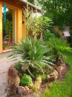 A Yucca gloriosa a kertben nagyon szép impozáns növény lett, szépen fejlődik, a kicsi sarjnövény is sokat nőt a legutóbbi hazautazásom óta.