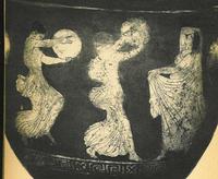 no. 105 The Caltanissetta tragic scene: possibly arising from his reluctance to see more than three actors in any one scene, Taplin supposes that the four figures in this most direct of all depictions are the result of a combination of scenes. It is not difficult to take one of the women as non-speaking, e.g. the one on the far left. Compare, as he does, the case of no. 22.