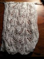 sziasztok, szép napot! Végre süt a nap, úgy igazán... hétágra. :-) Ma sikerül talán többet ülni a gép előtt, tegnap a Zuram teljesen lefoglalta. Végülis jó, legalább tudtam kötni :-) na meg van végre egy rendes Windows rajta. Ma a saját simításaimat azért meg kellett ejtsem, úgy mint nyelvek, fotókezelő nem túl komplikált progi telepítése, meg ilyenek. Ma pedig (szégyen ide, szégyen oda) 10ig aludtunk... úgyhogy még mindig kissé kába vagyok... Annyit csináltam, hogy rendesebb fényben fotóztam le a sálat, csak még mindig lógnak belőle a szálak. Megvallom, a legnehezebb része a szélcsipke meg a központi rész összeillesztése volt... másfél órán keresztül varrtam, közben többször helyet változtattam, sehol sem volt elég kényelmes. Aztán a végén rájöttem, hogy a térdemre fektettem a két darabot, és a sötétkék nadrágon jól láttam a fehér szálakat, na azzal felgyorsultam, de ez csak az utolsó 30 cm-n jutott eszembe... A méretei: 160*67 cm. Nem a legkisebb darab, amit kötöttem. És 46 gramm. Ez is pihekönnyű... a képeken látszik nem csak a sál maga, hanem a gyöngyvirágminta meg a szélcsipke is
