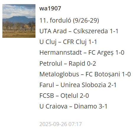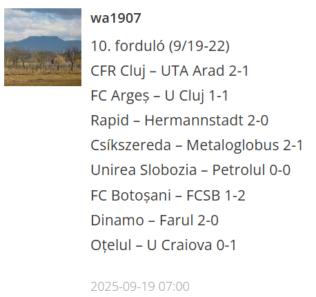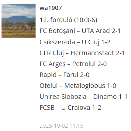 Az összetett állása (-1 meccs): 1. Bzzzzz07 263p 2. laszloka7 243p 3. orok meggyszin 219p 4. wa1907 202p 5. zsolyika 193p 6. luisharcsa 176p 7. bendeguz90 110p |