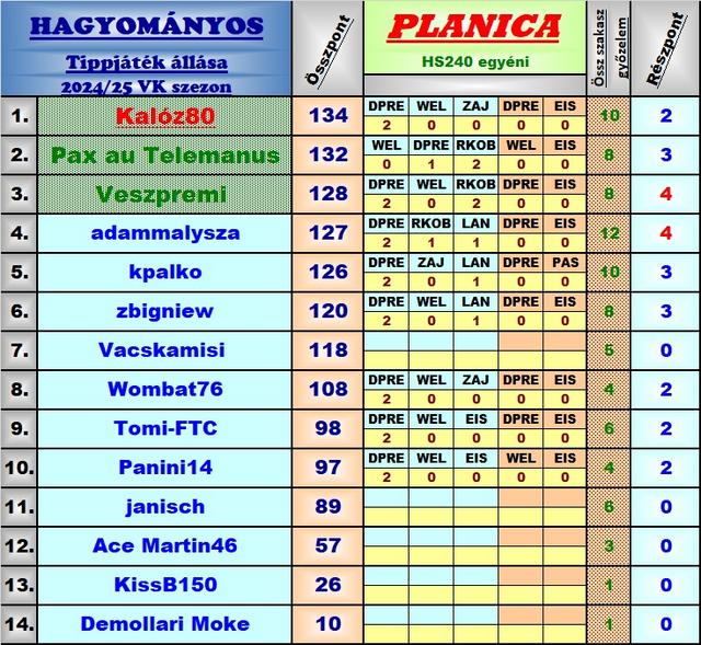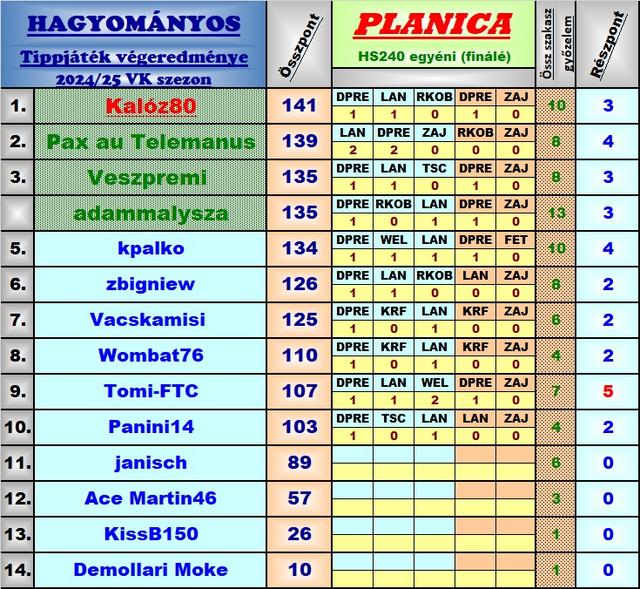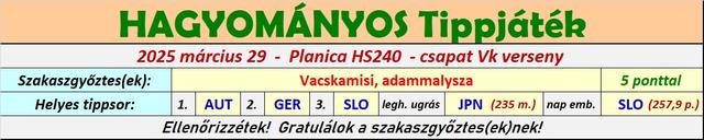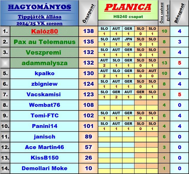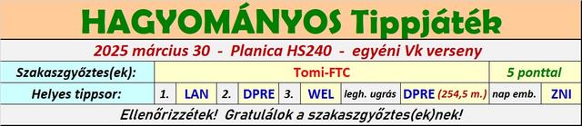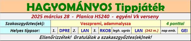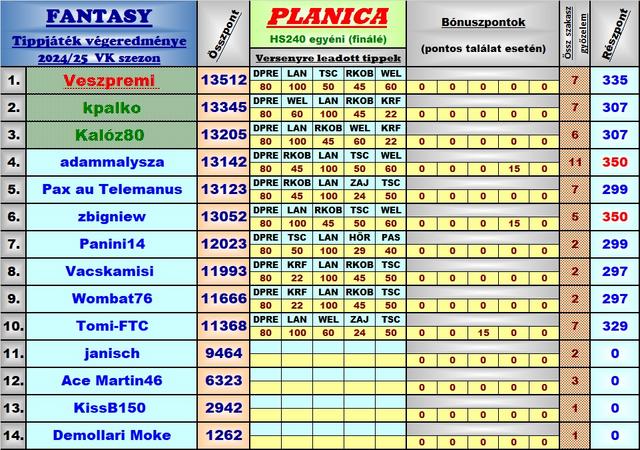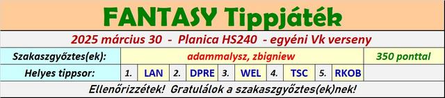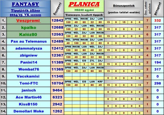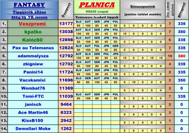 Harmadik éve tippelek úgy, hogy a versenyekből a munkám miatt élőben jó, ha 8-10 VK futamot látok, így bevallom meguntam, hogy néha még az első próbaugrások után leadott tippekkel versenyzem, ezért is hagytam abba ebben a topicban a játékot, és maradt a másik. A stratégiám nem volt se jobb, se rosszabb másoknál, most nekem jött be, máskor meg nem szokott, de nyilván örülök, hogy működött a terv, és hogy belefért még az is, hogy Lanisek elmaradt Japán túrája miatt két be nem tervezett cserét is el kellett használnom.