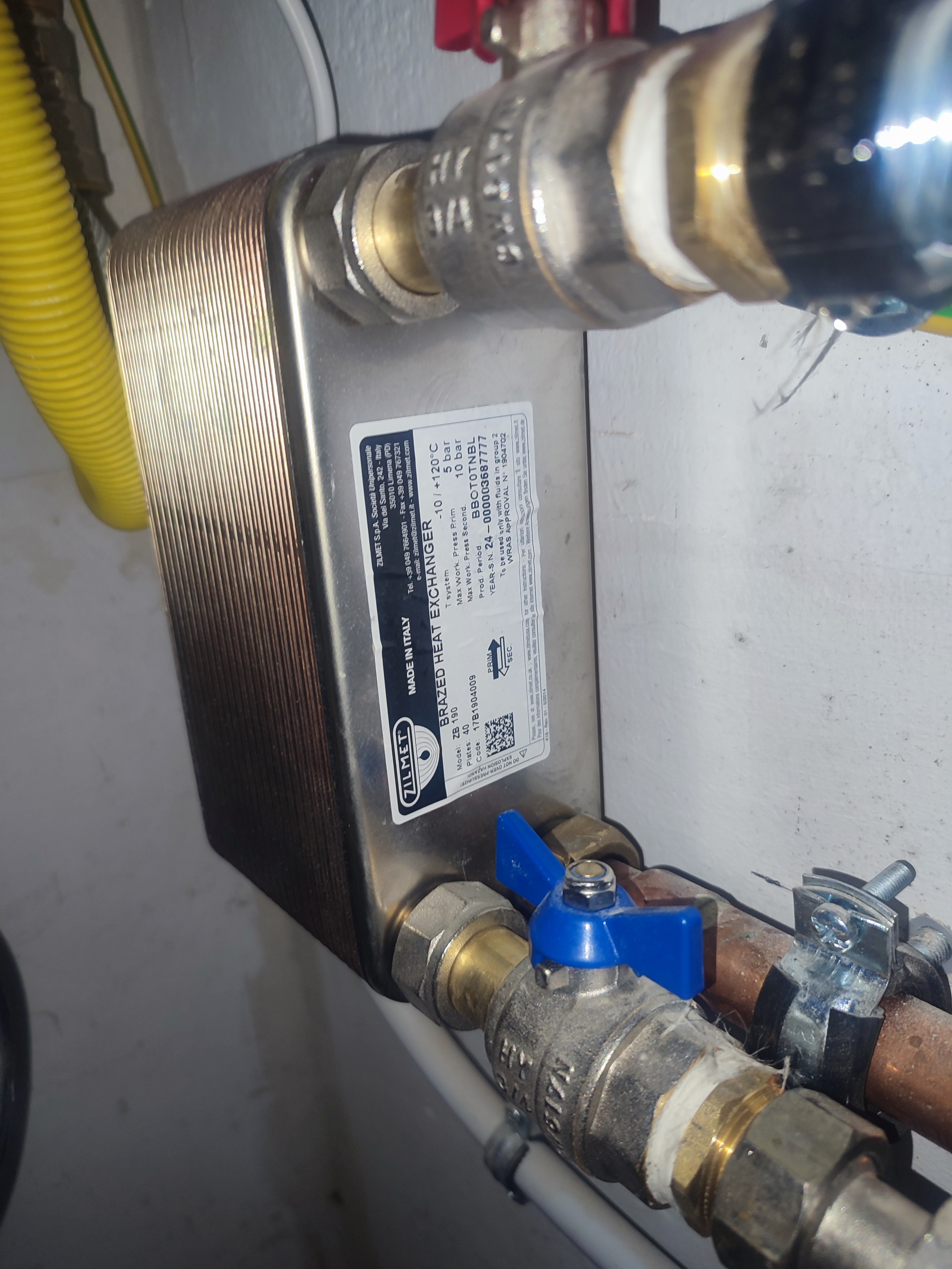 Igen a hőcserélő nem ellenáramban kötötték be. Külső alsó a szekunder visszatérő felső az előremenő, belső réz alsó a kazán előremenő, felső a visszatérője.