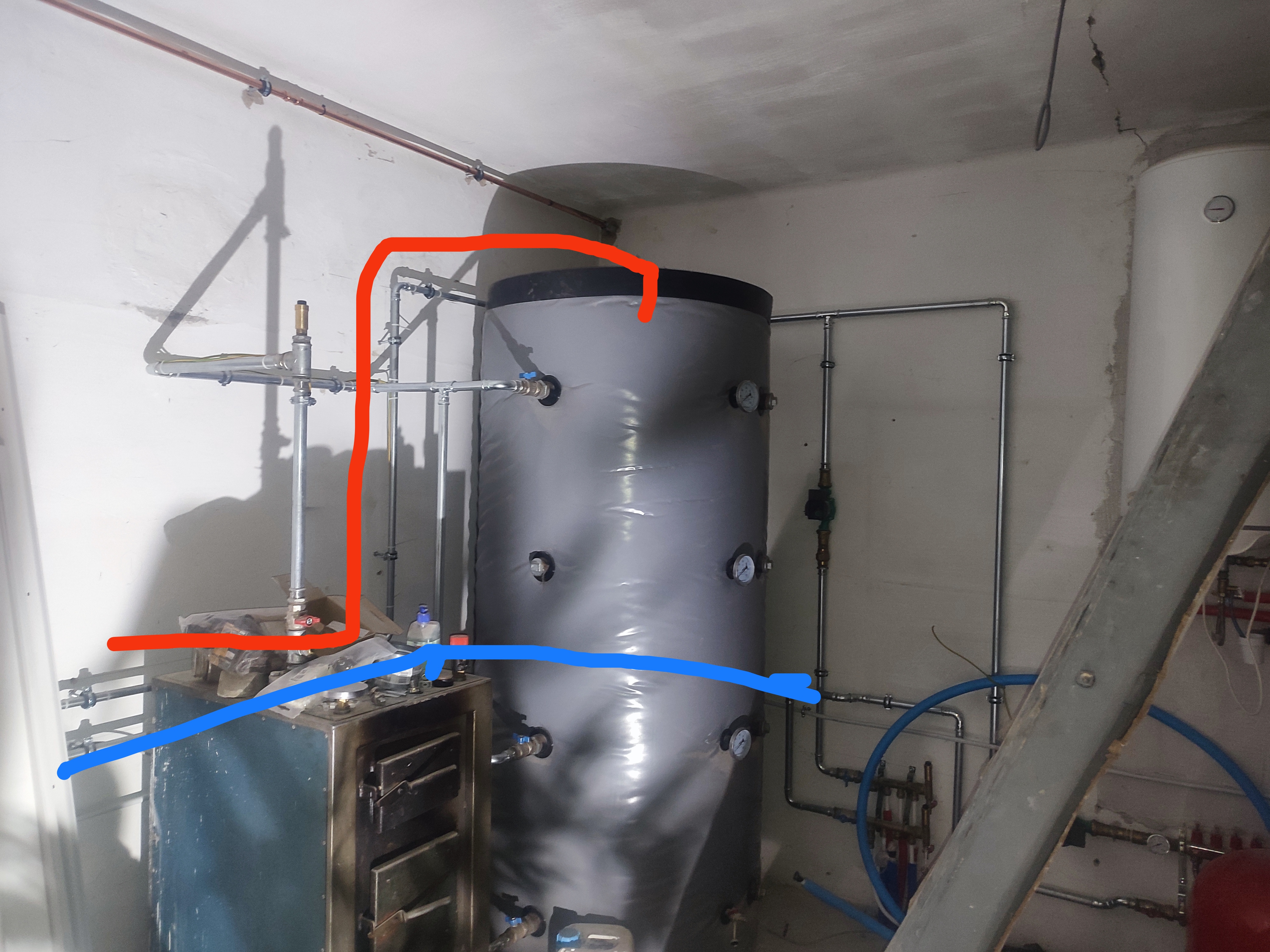 Igen. Felül a puffer tetejénél van automata légtelenítő itt csatlakozik be az újabb gázkazános melegoldal. A puffer és minden más kazános rész le van zárva golyóscsappal. Később lesz csak bekötve a radiátoros rész jelenleg nem üzemel és el van zárva.