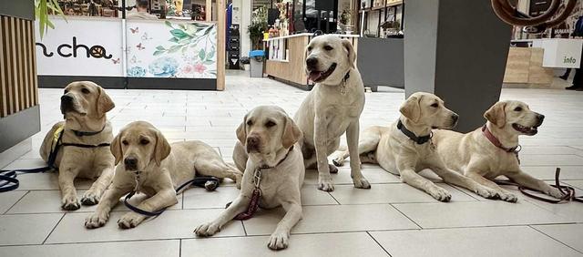 Plázáztak a kölykök A vakvezető kutya mindenhova elkíséri látássérült gazdiját. Akkor tud a legjobban vigyázni a lépteire, ha semmi sem vonja el a figyelmét a feladatától. Nevelésben lévő kölykeinket éppen ezért fokozatosan ismertetjük meg a forgalmas helyekkel, például pályaudvarokkal, közlekedési csomópontokkal, plázákkal. Mire képzésbe kerülnek, már közömbösek lesznek az ott tapasztalható ingerekkel szemben. A képen a K, L, I és J alom kölykei pihennek el egy csoportkép erejéig az egyik forgalmas budapesti bevásárlóközpontban.