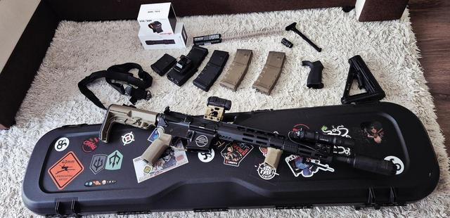 + Magpul CTR stock, Magpul grip, milspec spring, Magpul asap QD plate, Milspec charging handle, birdcage, tisztitó készlet