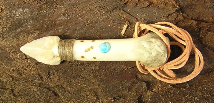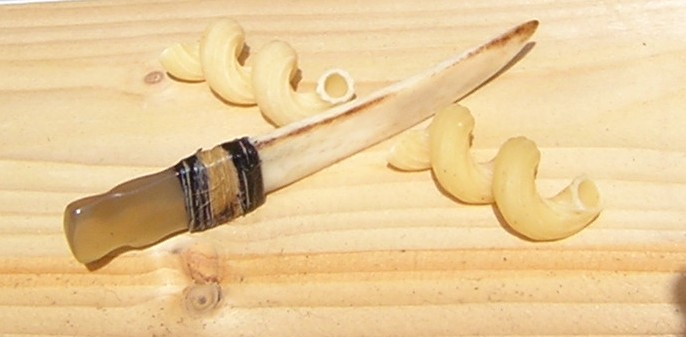 A kitűnő fogású csontmarkolatok a veszedelmes barlangi nyúl lábszárcsontjai, a két kés és a kanál vulkáni üvegből (obszidián) lett pattintva, a vadásztőr egy rémszarvas eredeti tartozékaiból készült, a rögzítéseket korom+fenyőgyanta alkotta. De a csontok felhasználása sem maradt abba, itt látható, hogy korukat megelőzve már a csavart is elvágták a csontkésükkel.