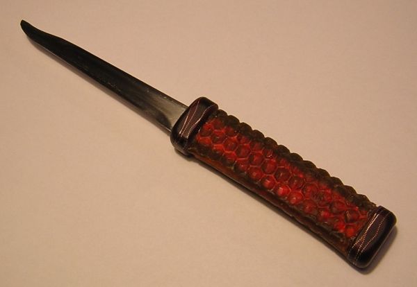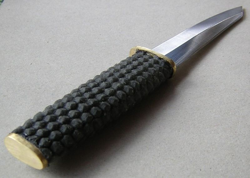 A markolat borítása már szokatlanabb. Ugyanis autentikusan, valódi fekete ördögbőrből készült. A bőrátültetés során egyetlen ördög sem károsodott. Túlzottan nagyon. A markolat hossza, amennyit az ördögbőr kiadott 92 mm.