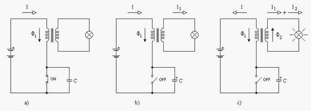 a) ábra: A megszakító zár. A primer tekercsen átfolyó I áram létrehoz a trafó vasmagjában egy Φ1 mágneses fluxust. b) ábra: A megszakító nyitja a primer áramkört. A Φ1 fluxus nem tűnhet el hirtelen, ezért az önindukció miatt a C kondenzátor feltöltődik. A csökkenő Φ1 fluxus a szekunder tekercsben elkezdi a rajz szerinti irányú I1 áramot létrehozni. c) ábra: A C kondenzátor az eredeti primer árammal ellentétes irányban elkezd kisülni. Ez a kisülő áram létrehozza a trafó vasmagjában a Φ2 mágneses fluxust. Ami ellentétes irányú a Φ1 fluxussal de növekvő, ezért a szekunder tekercsben az I2 áramot hozza létre. Ami azonos irányú az I1 árammal, ezért összegződnek. Az egyszerűség kedvéért tételezzük fel hogy I1 = I2. Kétszeres áram az négyszeres energiát jelent.