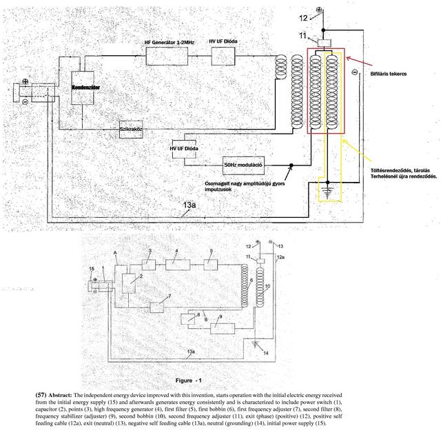 WO2008103129A1 (Kapanadze) — Kulcspontok: „first bobbin / second bobbin”, "frequency stabilizer", "converts the independent energy received by the second bobbin from the air to electric energy", explicit ground terminal és self feeding cable elemek. A dokumentum leír olyan blokkokat (rezonátor, szűrők, frequency adjuster, storage), amelyek egy HF rezgőkört és egy környezeti csatolást írnak le.