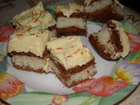 Elkészítés: A tészta hozzávalóit a megadott sorrendben összekeverjük, majd 2db félkeménységű cipót formálunk belőle. Ha nem akar összeállni, akkor tegyünk bele 2-3ek tejet. A tojásfehérjéket habbá verjük, beleöntjük a porcukrot és jól elkeverjük. A kókuszt is belekeverjük. A két cipót vékonyra kinyújtjuk a tepsit kikenjük margarinnal és beleterítjük az egyik lapot. Rákenjük a kókuszos tölteléket, beterítjük a másik lappal. Közepes lángnál 20percig sütjük. Hagyjuk kihűlni. A krém készítése: a tejet elkeverjük a tojás sárgákkal, a van.cukorral, liszttel, és sűrű krémet főzünk belőle, majd hagyjuk kihűlni. A margarint a porcukorral elkeverjük ,a kihűlt krémet hozzáadjuk, és csomómentesre eldolgozzuk. Ezt a krémet rákenjük a kihűlt tészta tetejére, csoki reszelékkel megszórjuk.(a közepe olyan lesz mint a bonty csoki) nekem csak színes cukrom volt itthon ilyen lett: