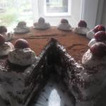 A töltelékhez: *10 dkg tejszín, *2 teáskanál instant kávé, *4 cl konyak, *20 dkg tej tortabevonó, *2 deka fehér csokoládés tortabevonó