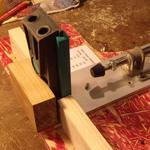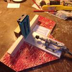 Az alaplapról leszereltem a furatvezetőt (két csavar) a helyére egy 50*80*30 mm-es tölgy deszkát csavaroztam. Ennek támasztom neki a Volfcraft fúróvezetőt. Megoldott a gyors szorítás, és az állíthatóság.