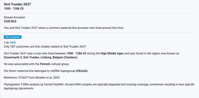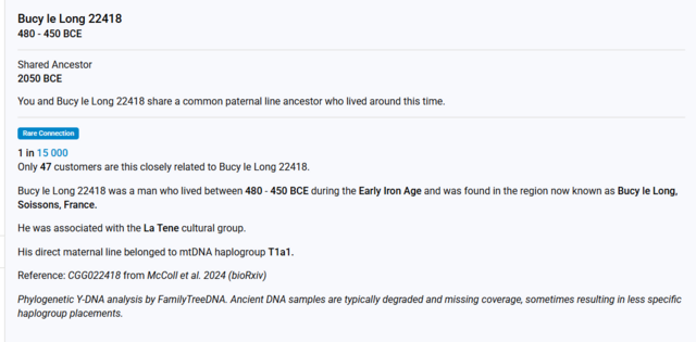 Kaptam néhány új archaikus mintát apai ágon az FTDNA cégtől, egyet a középkori belga Truidenből és ókori keltákat a francia Bucy településről, most a legközelebbi minta hozzám egy ókori kelta Bucyból, 4000 éve élt a közös ősünk.