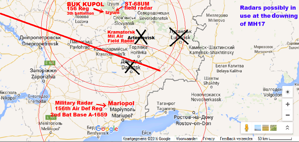 “EUROCONTROL zei: Oekraïne heeft ons niks gemeld. Maar de ambassadeur zegt dat Artemivsk en Donetsk kapot waren, Dnipropetrovsk lag te ver en Tsjoegoejev was in onderhoud. Ja, dat zijn dus vier radarstations. En hoe zit het met de Oekraïense militaire radar? Google Translation : Eurocontrol said Ukraine has notified us nothing. But the ambassador said Artemivsk and Donetsk were broken, Dnipropetrovsk was too far and Tsjoegoejev was in maintenance. Yes, that’s four radar stations.