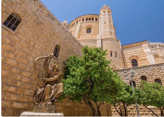 Dávid király(Izrael)a hárfán játszik szobra.A szobor, közel Dávid király sírjához Jeruzsálemben
